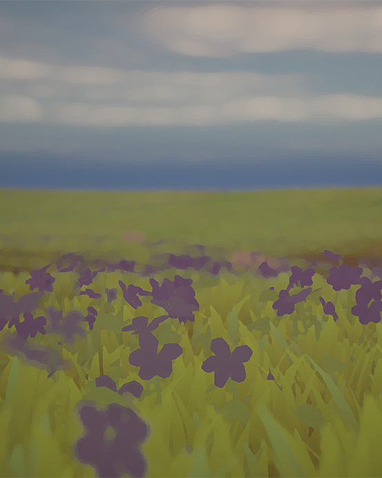 This scene was created using Unreal Engine 5's Terrain tools. I modeled the grass and violets in Maya. The density and base color of the foliage is dependent on the terrain texture, i.e. grass is less dense on dirt patches. There is a wind effect on the foliage using world position offset in the material and vertex color on the mesh. This also includes a shifting noise overlay in the diffuse channel to emphasize the wind. Lastly, I added a Kuwahara filter to the scene to add a painterly effect.