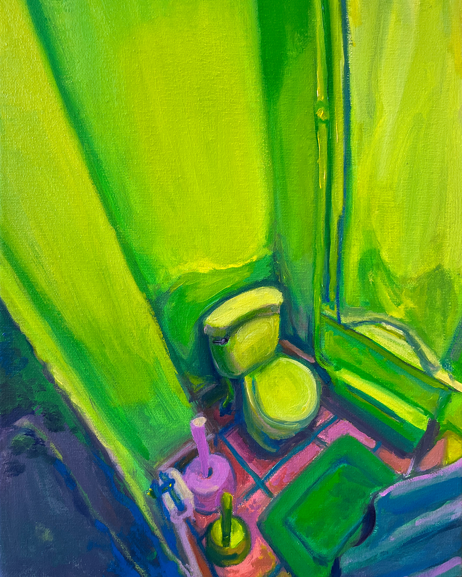 In 2024, I was interested in exploring bathrooms as a space for privacy, so I did a painting of my friend's bathroom in his dorm. It had an odd room layout, so I decided to exaggerate the color palette and perspective to make the scene feel uneasy.